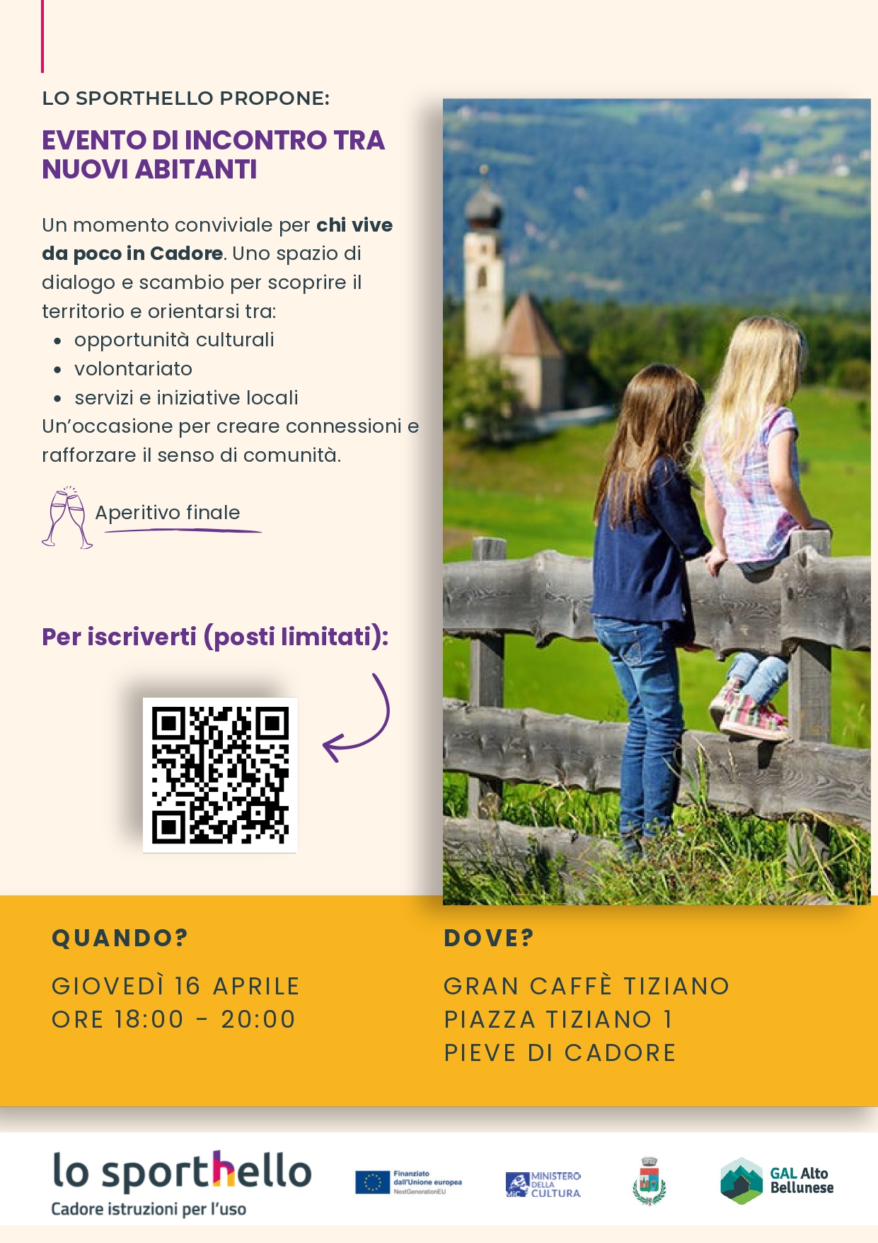 LO SPORTHELLO PROPONE: Un incontro che vuole offrire uno spazio di dialogo e conoscenza reciproca tra nuovi residenti e comunità locale, anche grazie al coinvolgimento di alcuni “testimonial” del territorio che possano facilitare questo processo di integrazione.