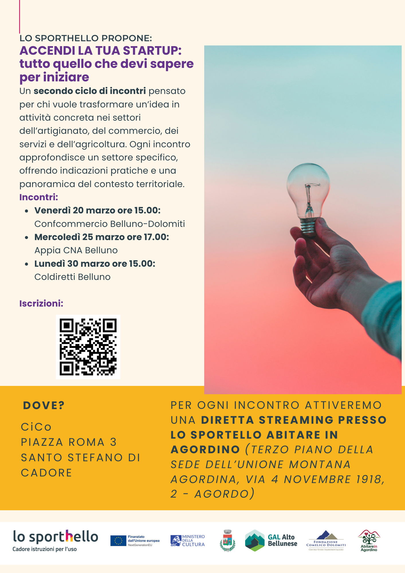Il ciclo, dal titolo “ACCENDI LA TUA STARTUP: tutto quello che devi sapere per iniziare”, è composto da tre appuntamenti, ciascuno focalizzato su un settore specifico: commercio e servizi, artigianato e agricoltura. Gli incontri saranno curati da Confcommercio Belluno-Dolomiti, Appia CNA Belluno e Coldiretti Belluno.